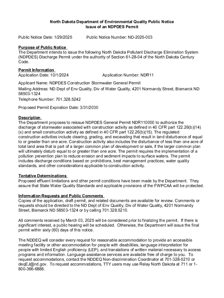 This document serves as a public notice for the issuance of a North Dakota Pollutant Discharge Elimination System (NDPDES) permit concerning stormwater discharges from construction activities. It