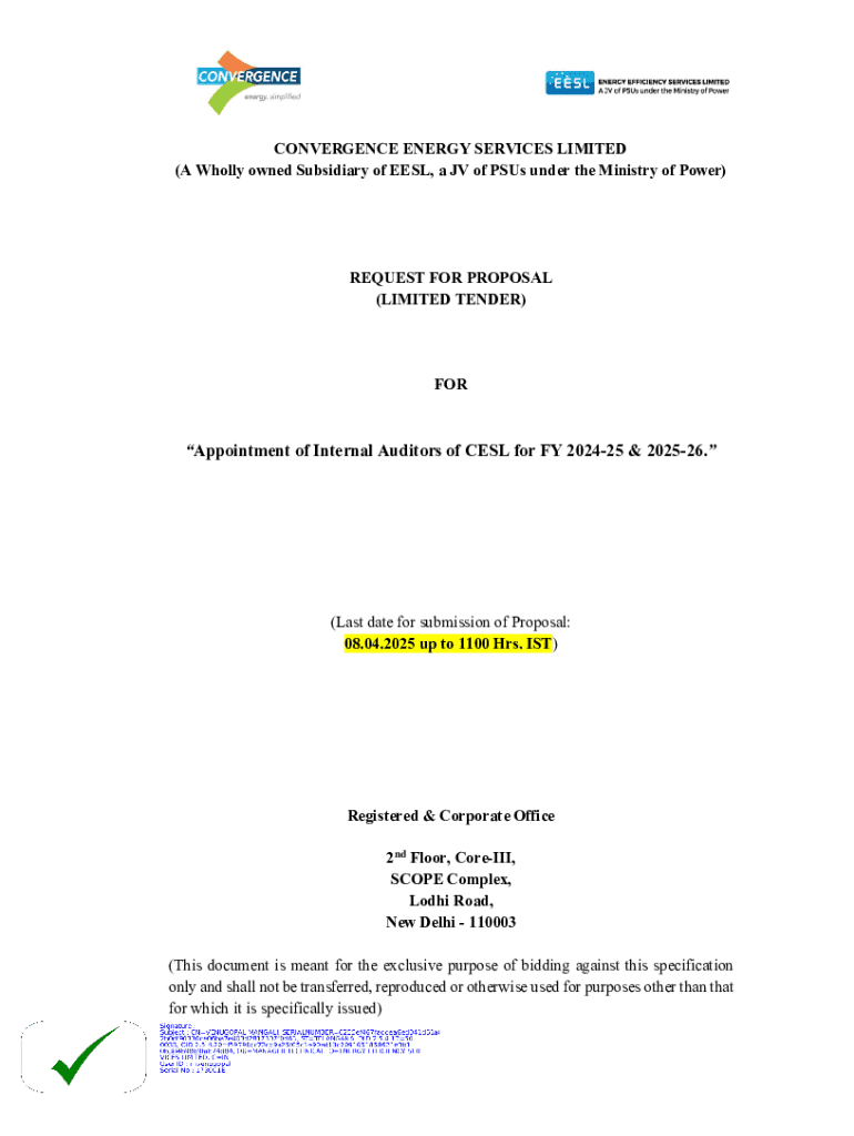 This document outlines the terms and requirements for bidding on the appointment of internal auditors for Convergence Energy Services Limited for the financial years 2024-25 and 2025-26, including