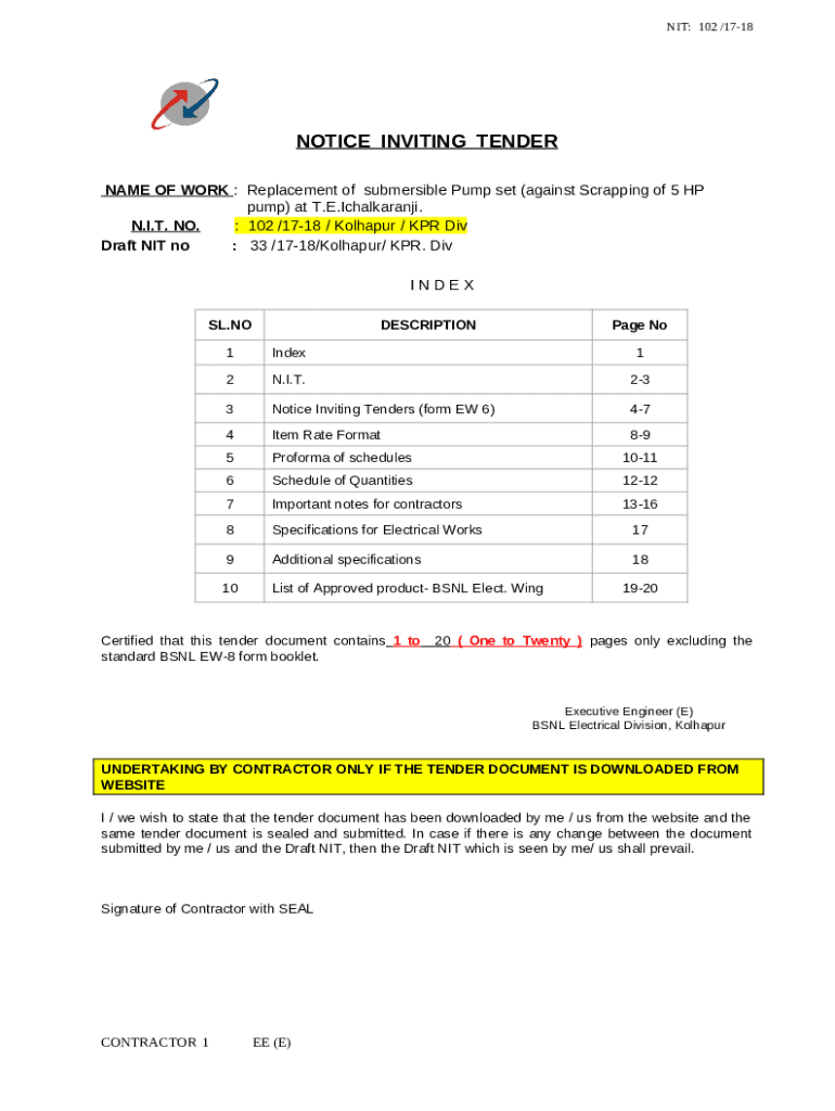 The Notice Inviting Tender is a document needed to be submitted to the specific address to provide specific information. It needs to be filled-out and signed, which can be done in hard copy, or by using a certain software e. g. PDFfiller. This tool allows to fill out any PDF or Word document directly from your browser (no software requred), customize it according to your needs and put a legally-binding electronic signature. Once after completion, the user can easily send the Notice Inviting Tender to the relevant individual, or multiple ones via email or fax. The template is printable as well due to PDFfiller feature and options proposed for printing out adjustment. Both in digital and physical appearance, your form will have got clean and professional appearance. You may also save it as the template for further use, there's no need to create a new document from the beginning. Just amend the ready form.