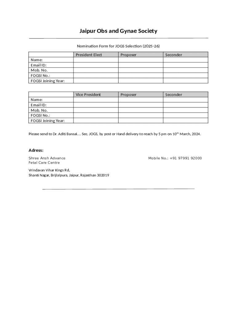 The Nomination for Jogs Selection (2025-26) is a writable document which can be filled-out and signed for specific purposes. Then, it is furnished to the exact addressee in order to provide some info and data. The completion and signing is able in hard copy or via an appropriate solution like PDFfiller. Such applications help to submit any PDF or Word file online. While doing that, you can customize it depending on your requirements and put legit electronic signature. Upon finishing, the user sends the Nomination for Jogs Selection (2025-26) to the respective recipient or several recipients by mail and even fax. PDFfiller provides a feature and options that make your Word form printable. It includes various options for printing out appearance. No matter, how you deliver a document - in hard copy or electronically - it will always look professional and firm. In order not to create a new document from scratch over and over, make the original Word file as a template. Later, you will have an editable sample.