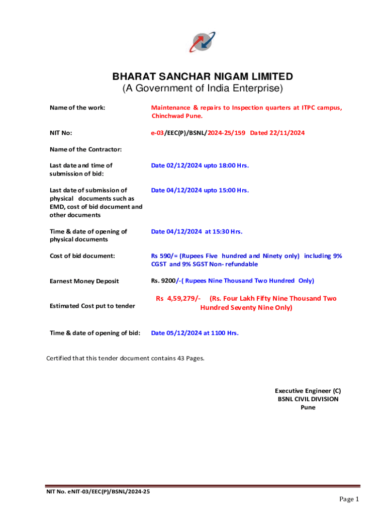 This document serves as an invitation for bids to maintain and repair inspection quarters at ITPC campus, Chinchwad Pune, by Bharat Sanchar Nigam Limited.