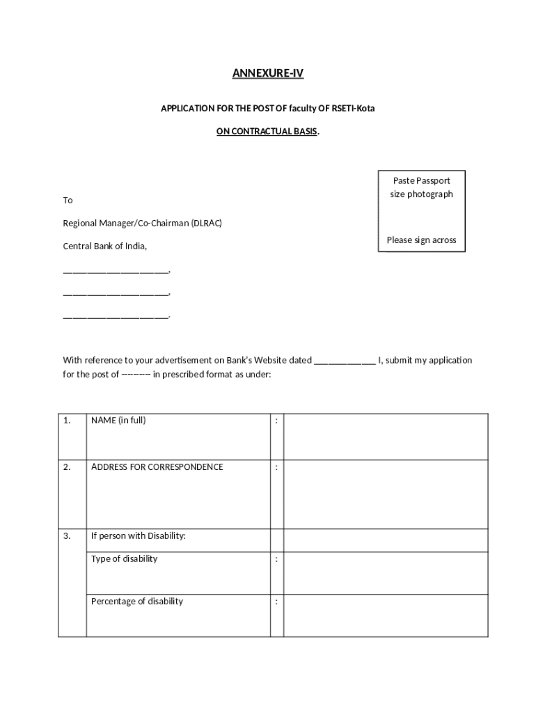 Instructions for the form Application for the Post of Faculty of Rseti-kota on Contractual Basis.