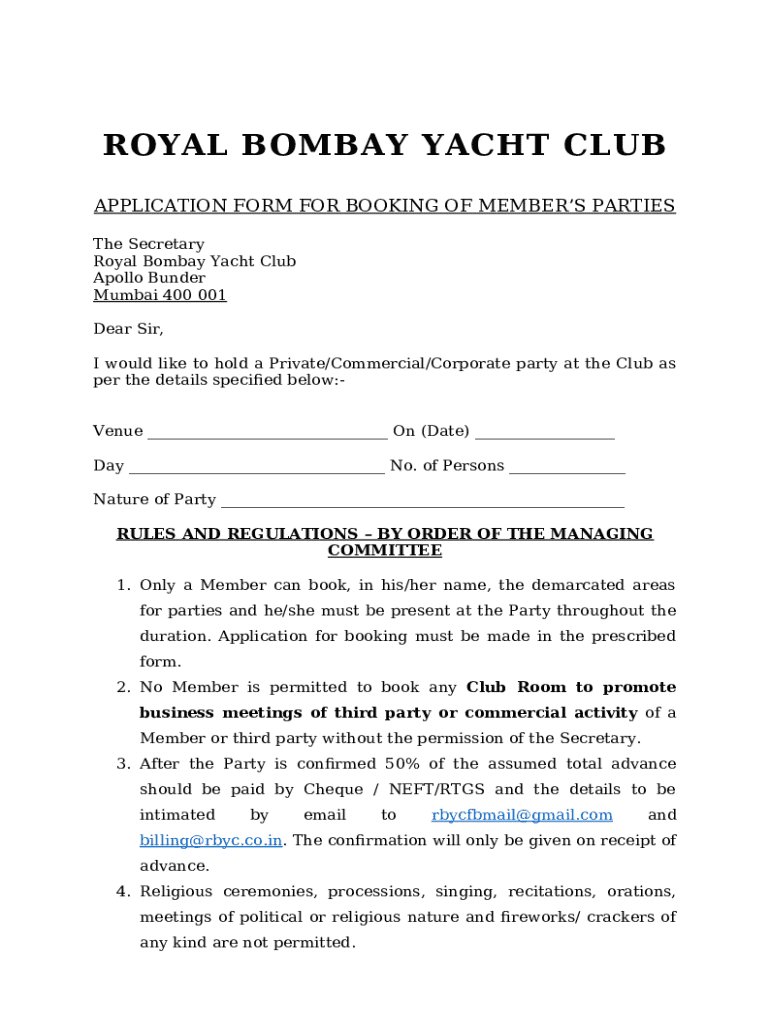 What is Application for Booking of Member's Parties Form?