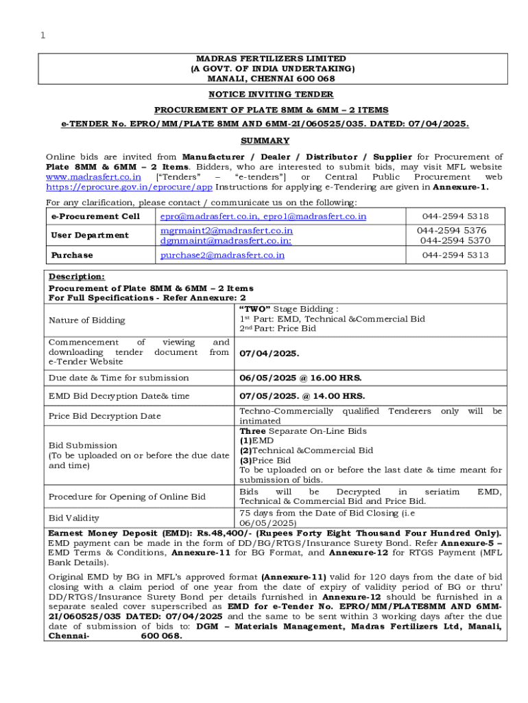 This document invites online bids for the procurement of specific plate items needed by Madras Fertilizers Limited, outlining the bidding process, specifications, and conditions for submission.