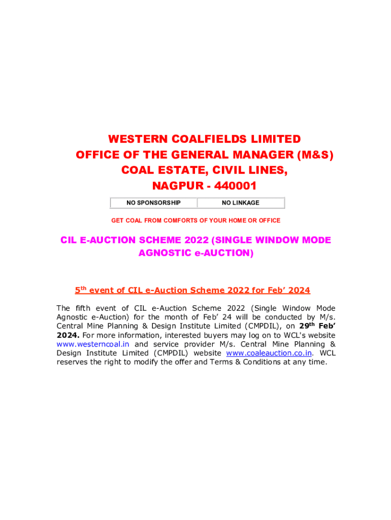 This document outlines the terms and conditions for participating in the CIL e-auction scheme for coal procurement held by Western Coalfields Limited, detailing eligibility, registration, bidding