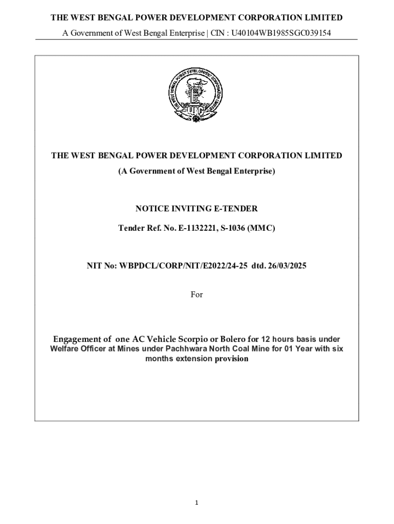 This document invites tenders for the engagement of one AC vehicle for 12 hours per day under the Welfare Officer at Pachhwara North Coal Mine, including specifications for bidding and contract conditions.