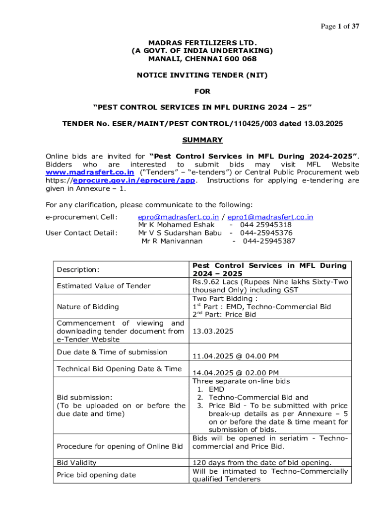 This document invites online bids for pest control services at Madras Fertilizers Ltd. for the financial year 2024-25, detailing the tender process, submission requirements, and terms of service.