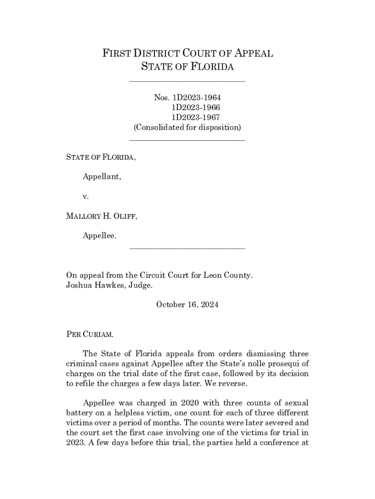 This document is a court decision from the First District Court of Appeal of Florida regarding the dismissal of criminal charges against the appellee, Mallory H. Oliff, due to procedural issues involving