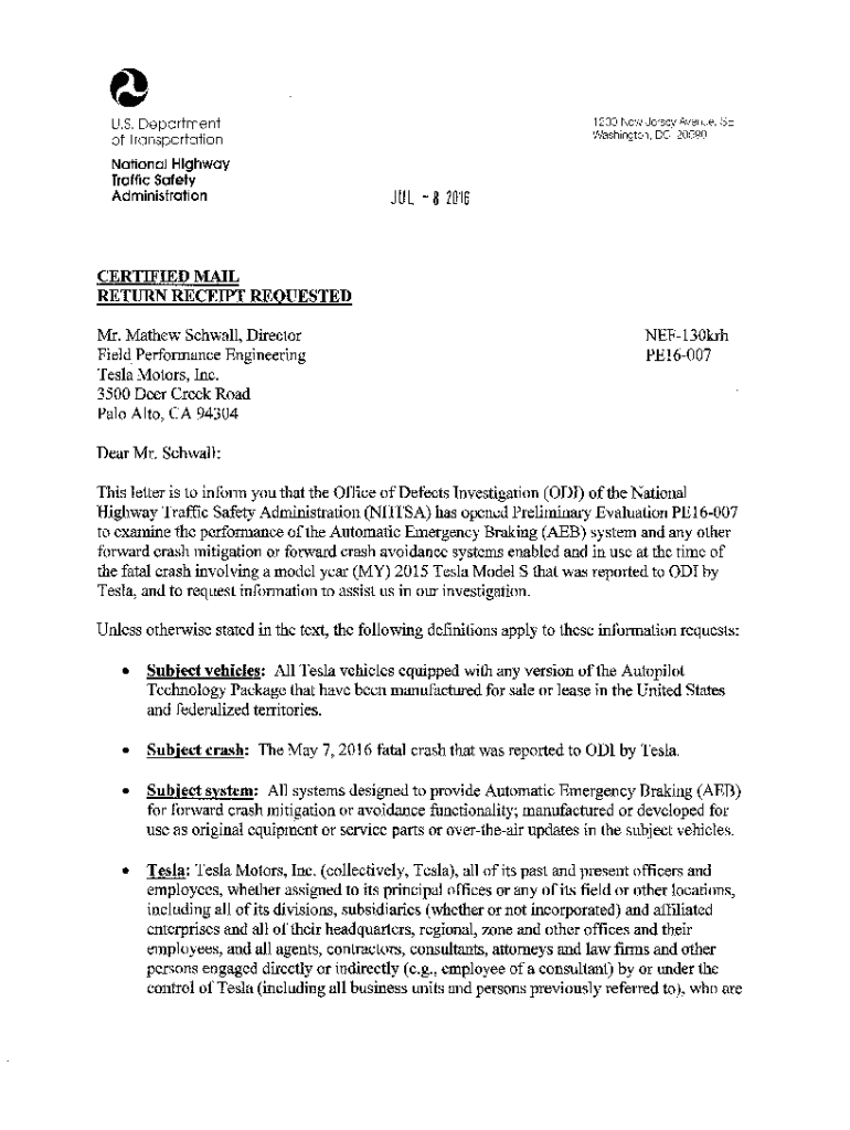 This document is a formal information request from the National Highway Traffic Safety Administration to Tesla regarding the performance of the Automatic Emergency Braking (AEB) system and its investigation