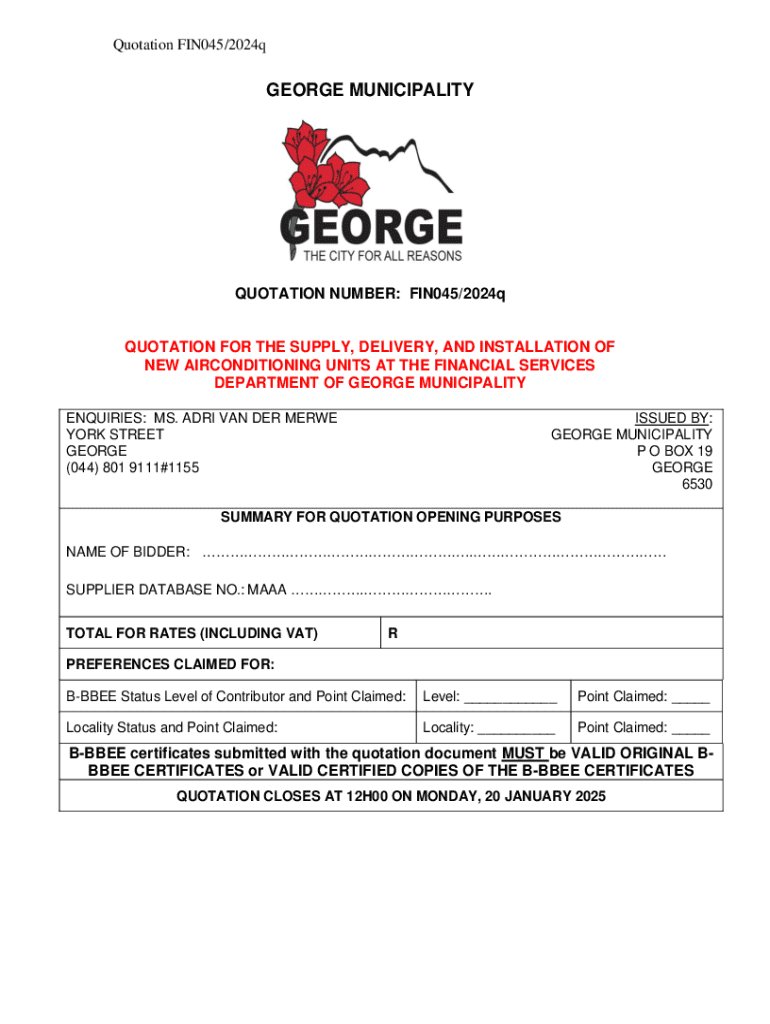 This document details the quotation requirements for supplying, delivering, and installing air-conditioning units at the Financial Services Department of George Municipality, including tender procedures