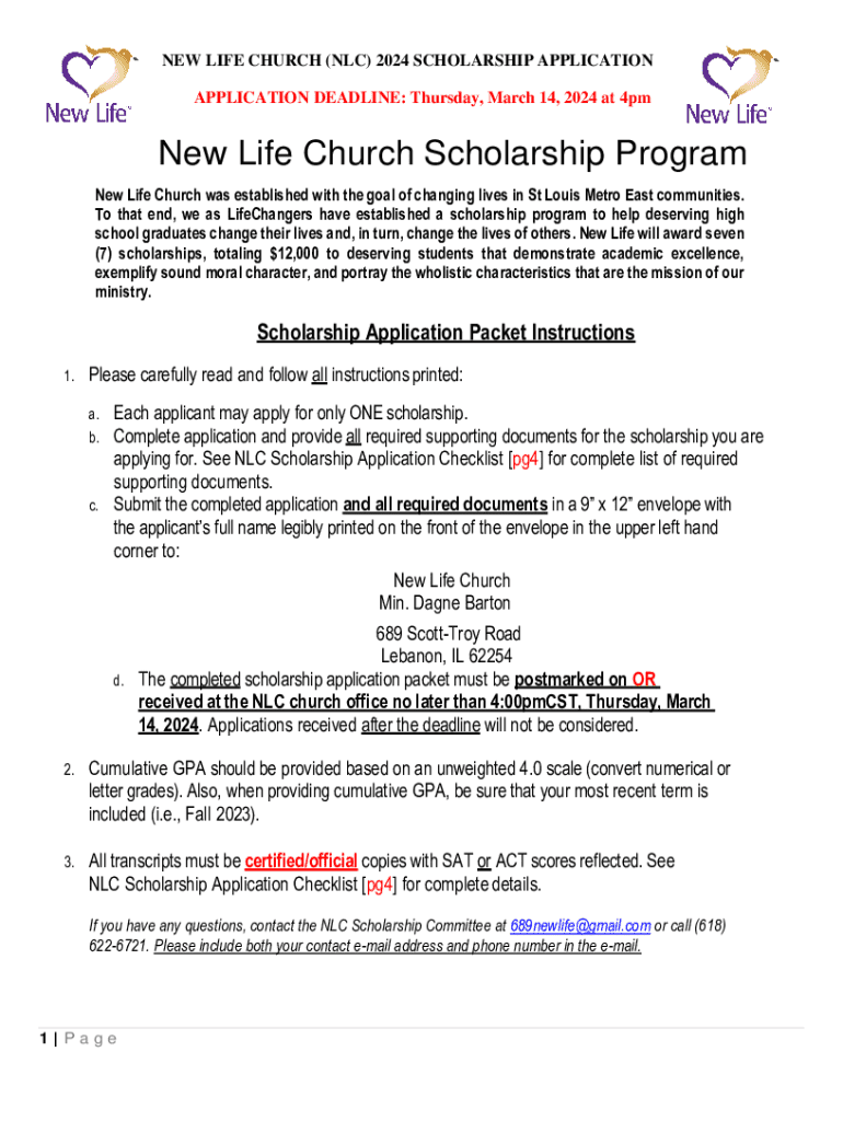 Get the free New Life Church (nlc) 2024 Scholarship Application