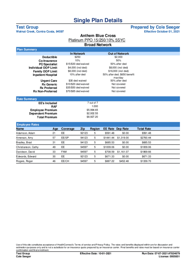 Test GroupPrepared by Cole SeegerWalnut Creek, Contra Costa, 94597Effective October 01, 2021Anthem Blue Cross