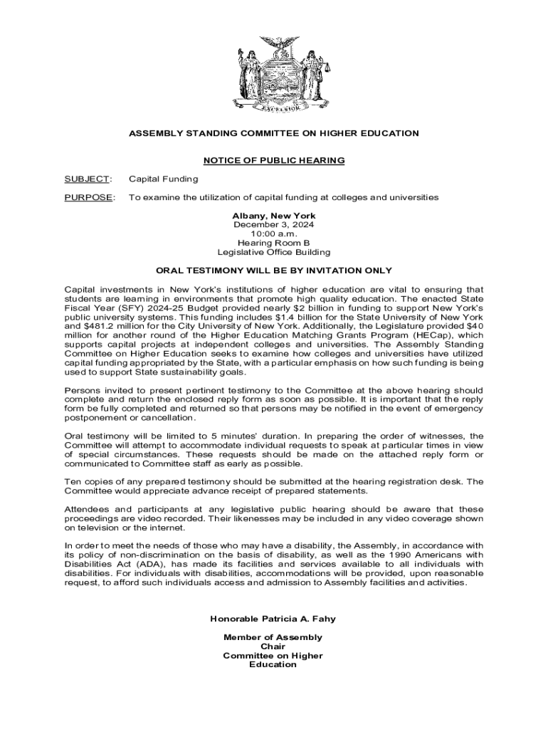 Get the free Notice of Public Hearing on Capital Funding