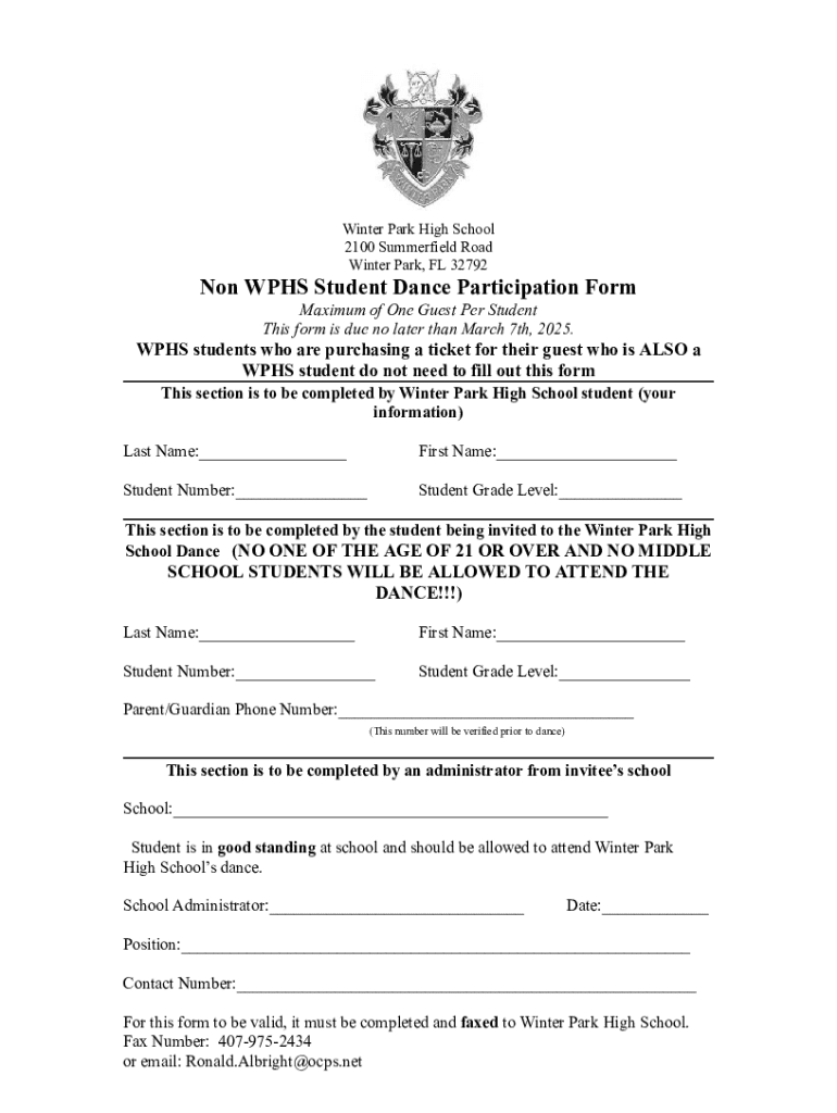 This form is for Winter Park High School students to invite non-WPHS students to a dance, requiring verification from the invitee\'s school to ensure eligibility.