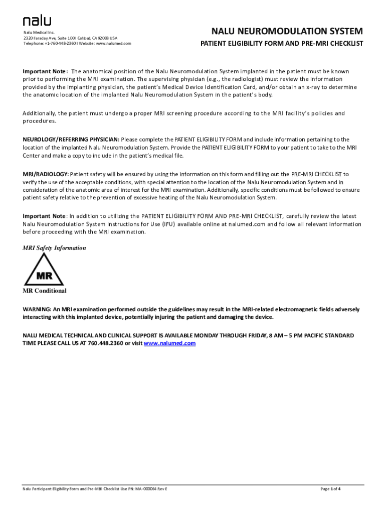 Get the free Nalu Neuromodulation System Patient Eligibility Form and Pre-mri Checklist