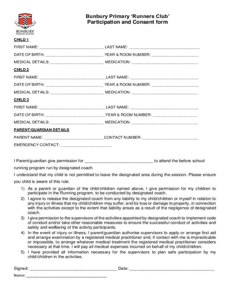 Get the free Bunbury Primary ‘runners Club’ Participation and Consent Form