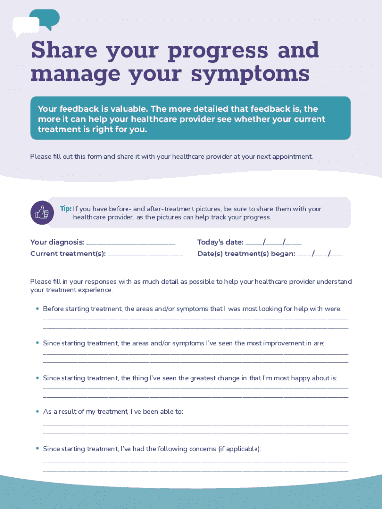 A treatment progress feedback form is a crucial tool designed to capture insights regarding a patient's experience and progress throughout their treatment journey. This document plays an essential role in enhancing communication between healthcare providers and patients, providing a structured manner to gather valuable feedback that can help refine therapeutic approaches.