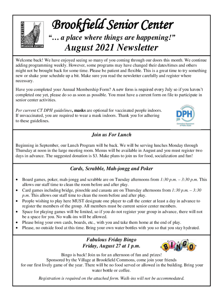 The Brookfield Senior Center newsletter serves as a vital communication tool within the community, aimed at connecting seniors with important information and resources tailored to their needs. This newsletter plays a crucial role in not only informing residents about events and programs but also fostering a sense of belonging and engagement among seniors. By providing updates and highlights, it ensures that the community feels informed and included in activities that matter to them.
