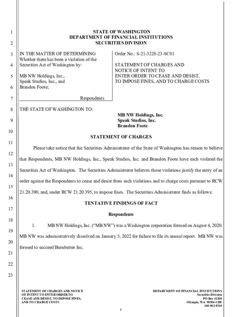 This document outlines charges against MB NW Holdings, Inc., Speak Studios, Inc., and Brandon Foote for violating the Securities Act of Washington. It details findings of fact related to unregistered