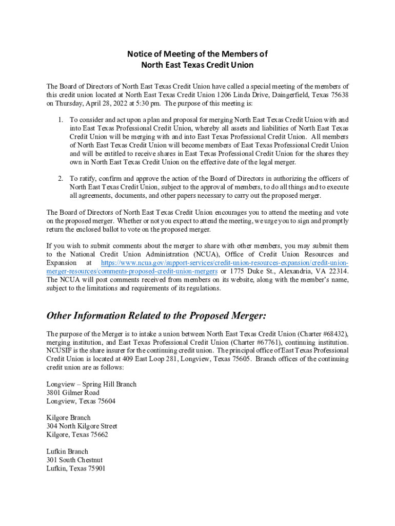 Get the free Notice of Meeting of the Members of North East Texas Credit Union