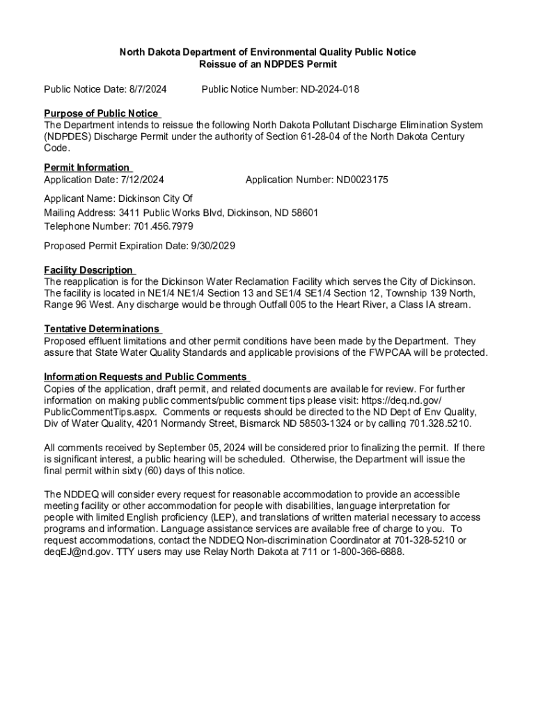 Get the free North Dakota Department of Environmental Quality Public Notice