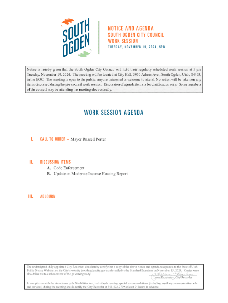 Get the free Notice and Agenda for South Ogden City Council Work Session