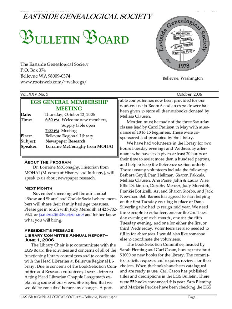 Monthly newsletter for the Eastside Genealogical Society, detailing upcoming meetings, educational programs, and opportunities for members to volunteer and participate in genealogical research and