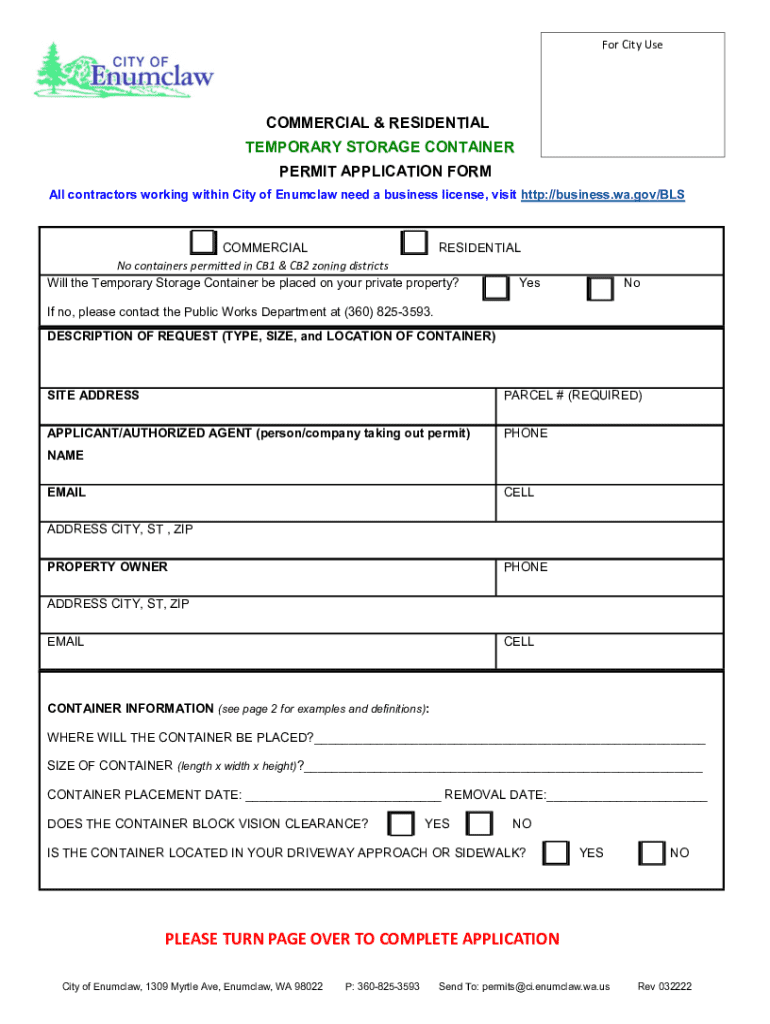 To apply for a temporary storage container permit, you must complete the appropriate form. Accessing the permit form typically involves visiting your local government’s official website or office. Most jurisdictions have this form available for download or online submission.