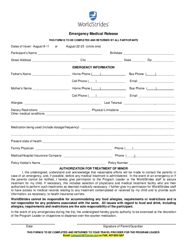 Additionally, it provides peace of mind for parents and guardians who are enrolling children in programs or activities. Knowing that they have authorized someone to make critical decisions in their absence means they can focus on the activity without constant worry. Emergency medical release forms are especially important in situations involving minors, as pediatric patients often require parental consent for treatment.