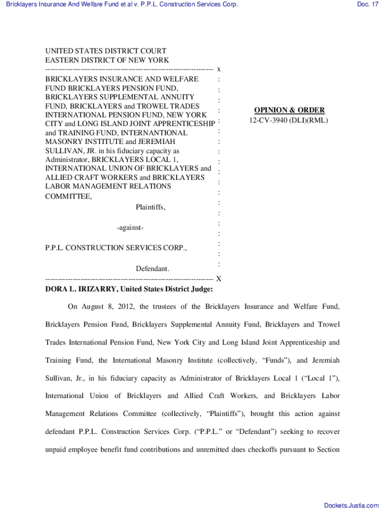 Get the free Bricklayers Insurance and Welfare Fund Et Al V. P.p.l. Construction Services Corp.