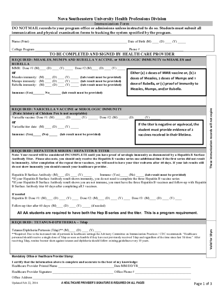 Get the free Nova Southeastern University Health Professions Division Immunization Form