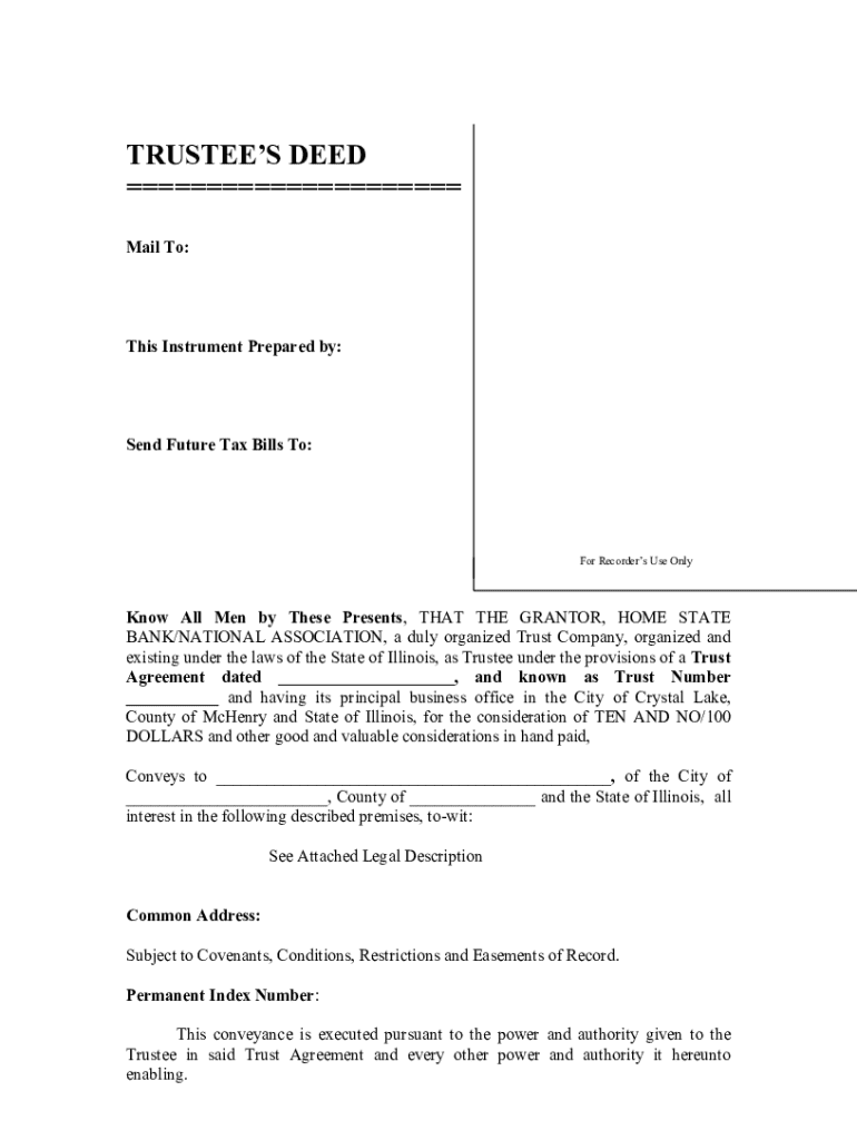 Furthermore, detailed information about the property, including prior title deeds and legal descriptions, should be available. Keep in mind that regulations regarding the trustee’s deed can vary significantly from state to state, making it essential to understand local laws governing property transfers to avoid legal complications.