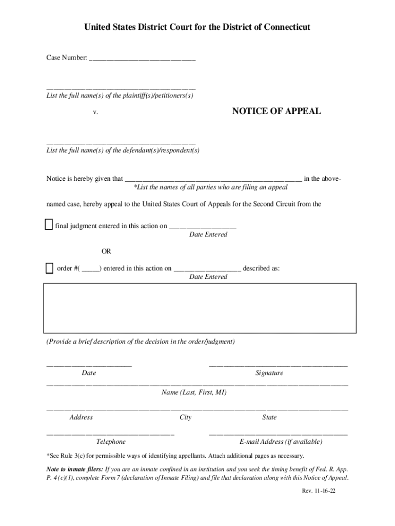 To fill out a notice of appeal, one must include the name of the court, the parties involved, the case number, the specific decision being appealed, and the grounds for appeal. It typically should be signed and dated by the appellant or their attorney.