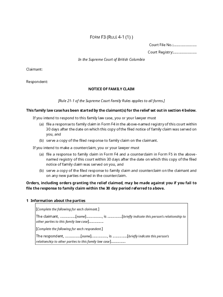 The Notice of Family Claim Form consists of several crucial sections that must be completed accurately. First comes the personal information section, which includes details of both the petitioner and the respondent. Additional components include the specific claims being made, as well as the relief or action being sought from the court.
