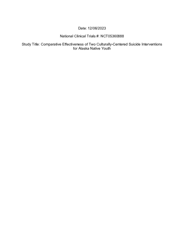 This document serves as a consent/assent form for a research study involving Alaska Native youth, focused on assessing the effectiveness of culturally-centered suicide interventions. It outlines the