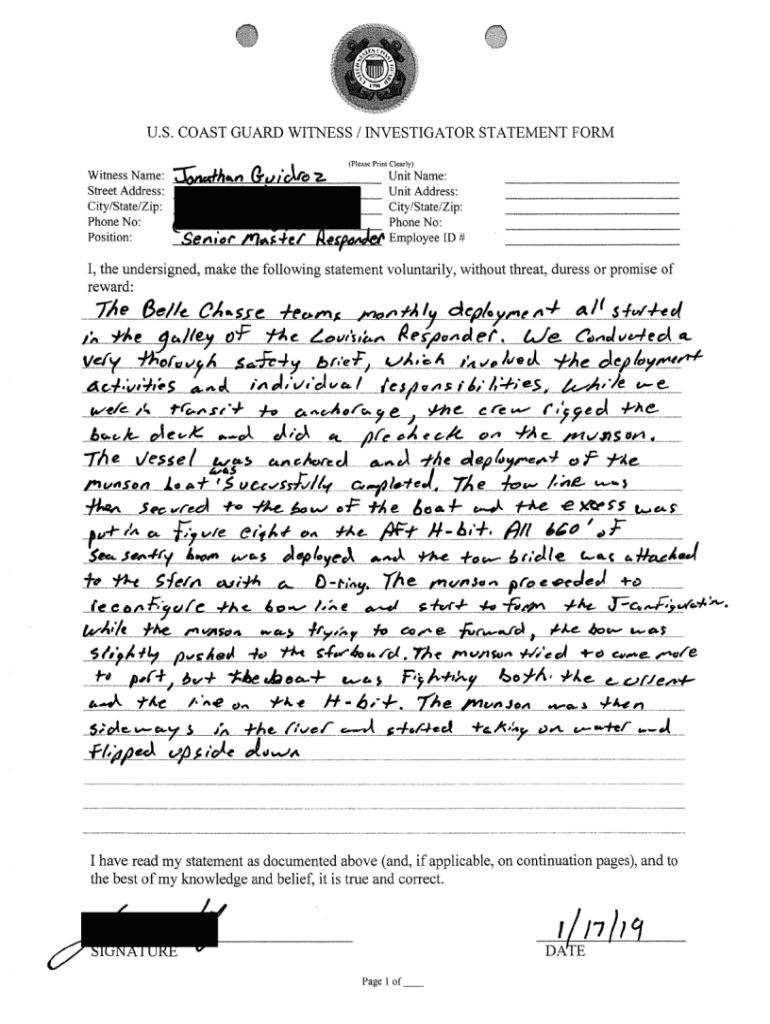 This document is used by the U.S. Coast Guard for collecting witness statements as part of investigations.