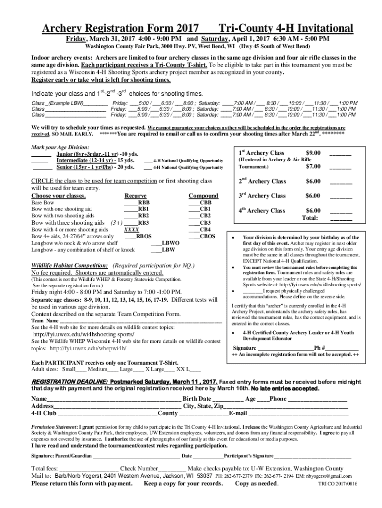The Archery Registration Form 2017 is a vital document that streamlines the process of enrolling participants in archery events and competitions. This form serves both as a means of officially registering archers and as a framework for event organizers to collect essential data, ensuring that all participants meet the necessary requirements and understand the event specifics.