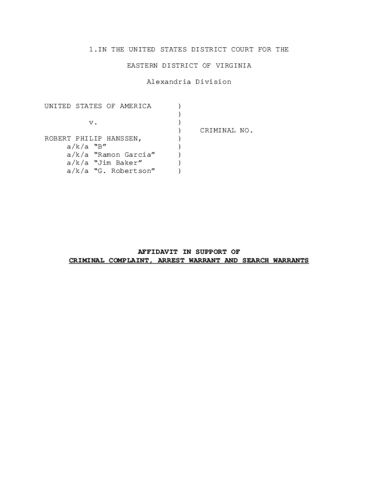 This document is an affidavit submitted by the FBI to support the arrest of Robert Philip Hanssen for espionage-related charges, detailing the investigation and evidence collected against him.