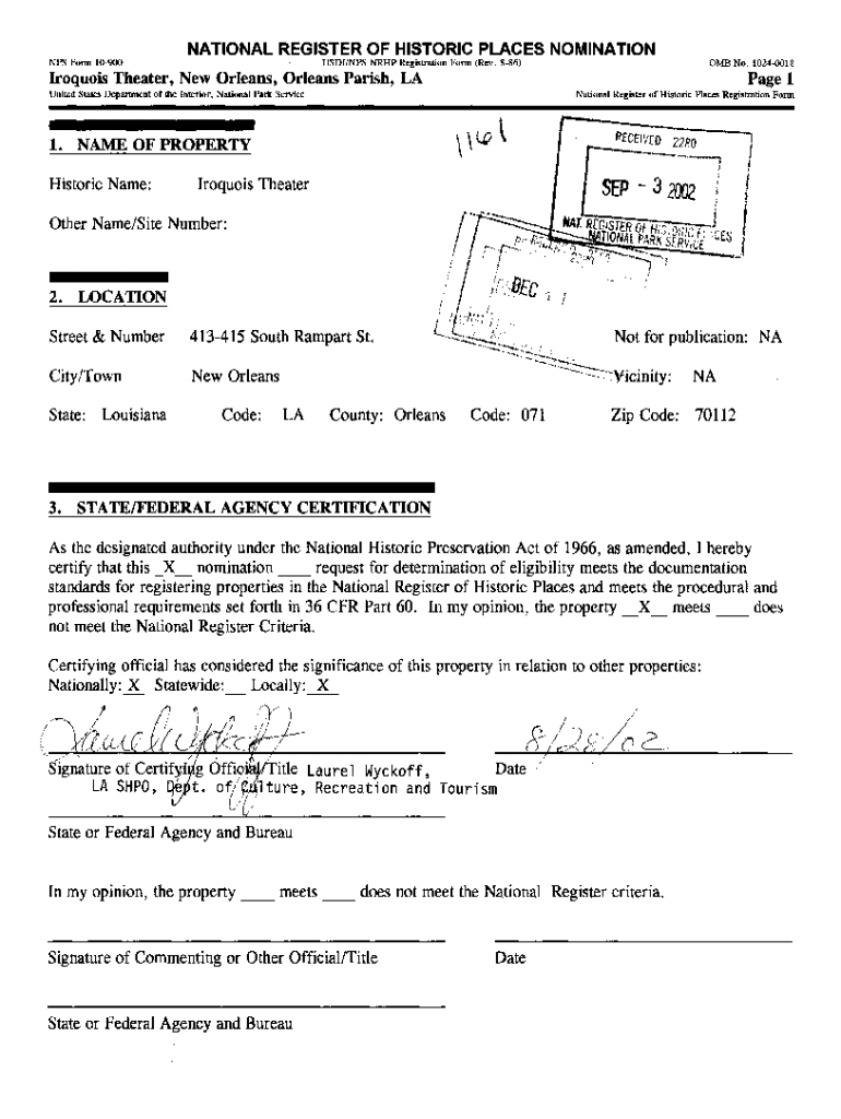 This document serves to register the Iroquois Theater in New Orleans as a historic place, detailing its historical significance, architectural details, and the context of its role in early jazz history,