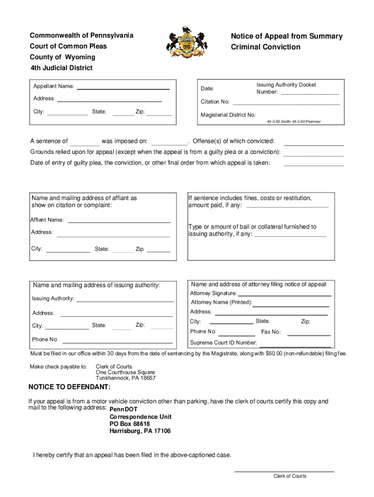 Get the free Notice of Appeal From Summary Criminal Conviction