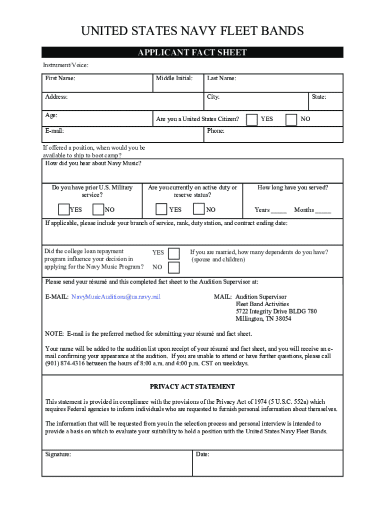 Horn Multiple Vacancies United States Navy Fleet Bands Applicant Fact Sheet 2025-2026 free printable template
