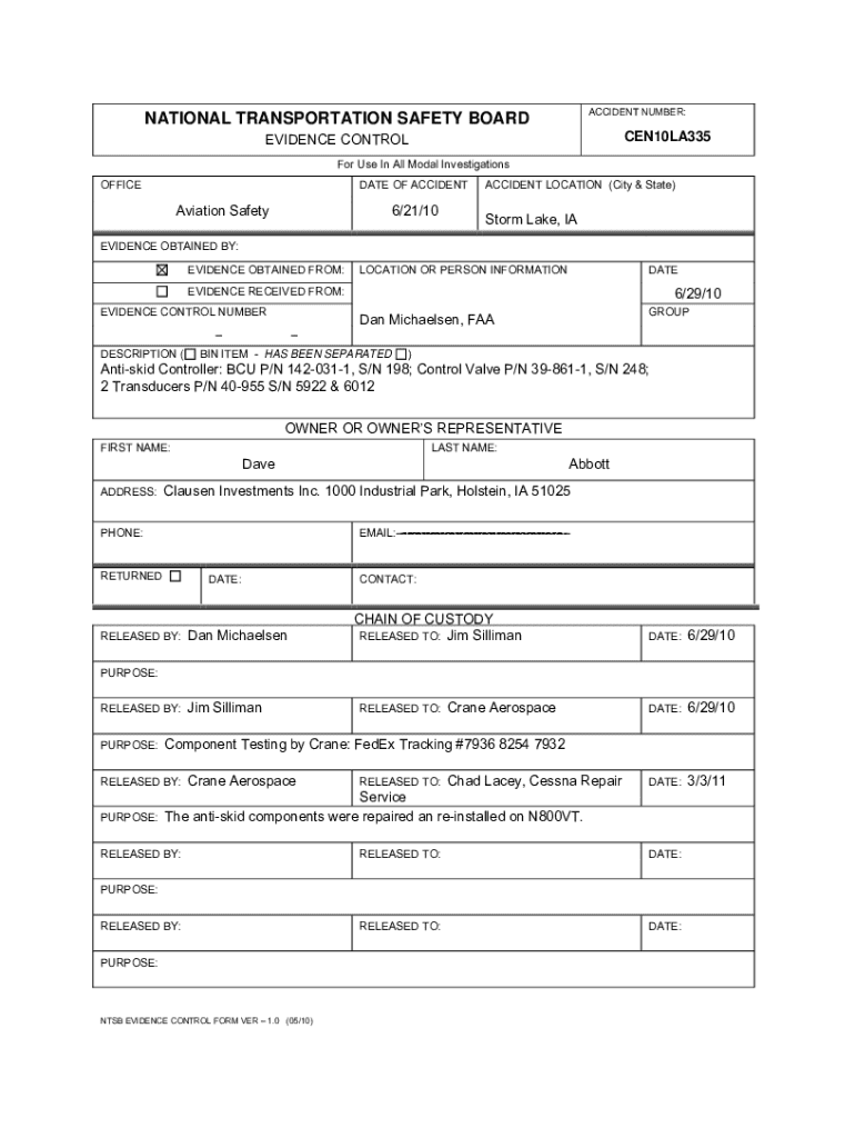 This document serves as an evidence control form for investigations conducted by the National Transportation Safety Board (NTSB) in aviation safety cases, detailing evidence received, chain of custody,