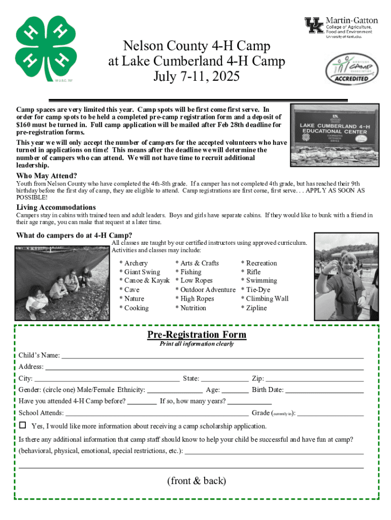Get the free Nelson County 4-h Camp Pre-registration Form - nelson ca uky