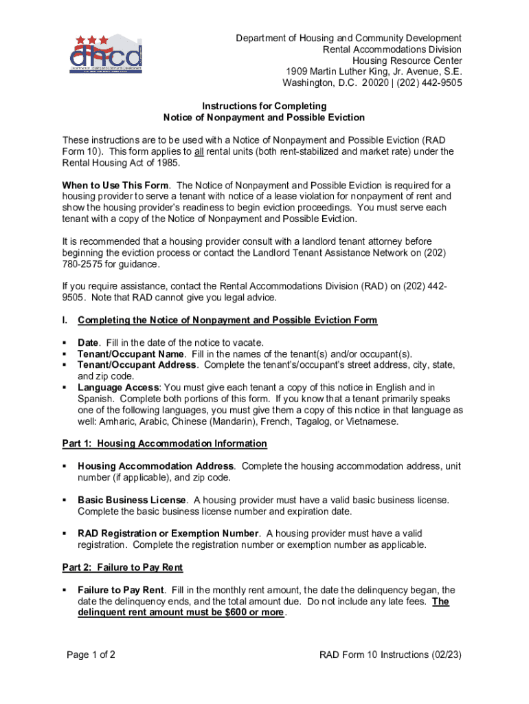 Get the free Notice of Nonpayment and Possible Eviction - dhcd dc