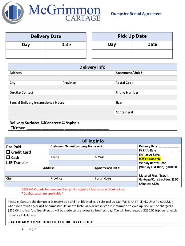 How to fill out dumpster rental agreement