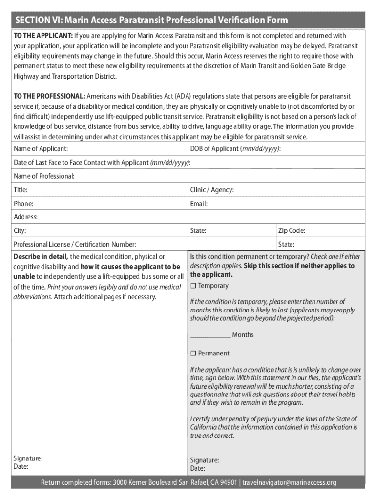 The Marin Access Paratransit Professional Form is an integral document required for eligibility verification. This form is necessary for both new applicants and those who are renewing their existing services. This form must be completed by a medical professional who can evaluate and describe the applicant's mobility challenges.