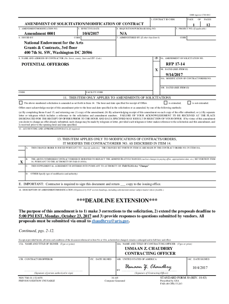 This document serves as an amendment to a solicitation/modification of contract, detailing corrections, deadline extensions, and vendor inquiry responses pertaining to the RFP issued by the National