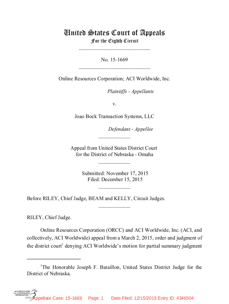 Get the free Online Resources Corporation V. Joao Bock Transaction Systems, Llc