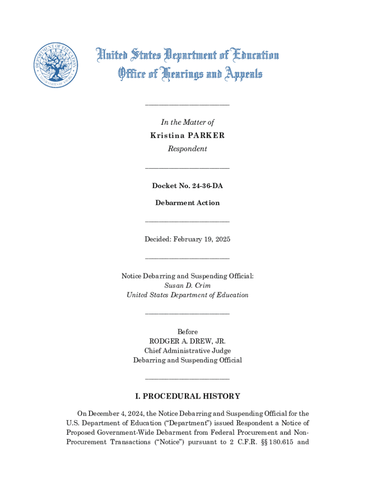 This document details the debarment action against Kristina Parker as a consequence of her criminal conviction related to federal financial aid fraud, outlining the procedural history, governing principles