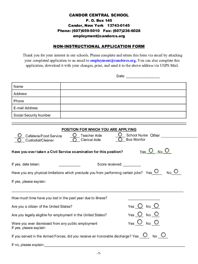 This form is used for applying for non-instructional positions at Candor Central School, including roles such as cafeteria staff, custodial, and clerical positions.